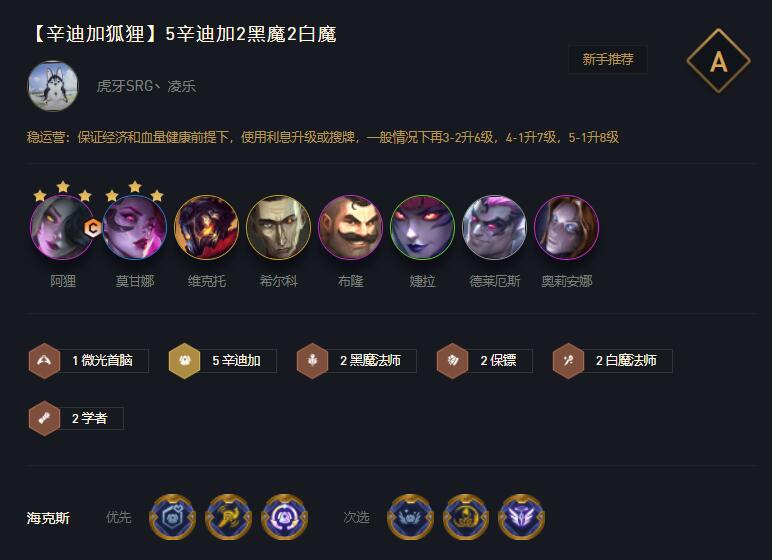 阵容坦度高,不怕高爆发体系,也不是很怕刺客,后期有维克托希尔科三星莫甘娜的上限,如果有辛迪加转职书开出七辛迪上限更高。比较害怕白魔体系,和卡莎(卡莎收割能力强,并且狐狸的技能不容易命中他)。这套体系成型比较简单,上限也是比较高的,连胜连败都可玩,大家赶紧尝试去上分吧。