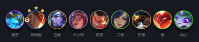 阵容英雄选择介绍:奥恩、乌鸦、亚索、卡尔玛、瑟提、艾希、巴德、慎、纳尔。