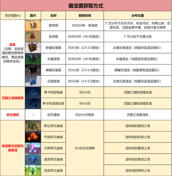 藏宝图可通过宝箱、击杀沉眠之海和努恩斯天空群岛的部分精英怪、击杀旧日遗蜕掉落