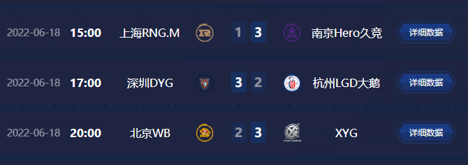 KPL夏季赛常规赛6.18赛果:2022KPL夏季赛目前各组的精彩对决正在火热进行中,目前,18支队伍的首秀基本已经完成了,在18日的比赛中,我们可以看到,第一场为我们带来精彩的是上海RNG.M和南京hero久竞,这两支队伍,从实力上来看,hero久竞这边要强上一些;最终两队的比分为1:3,南京hero久竞领先两分获得第一场的胜利!第二场中,深圳DYG对阵杭州LGD大鹅,两支队伍的实力相差不大,所以也注定了第二场打满局的结果,在最后一局,深圳这边拿到最关键的一分,以3:2胜出第二场;第三场中,草根队XYG对阵北京WB,最后XYG也以3:2险胜北京WB,虽然比分拉开不多,但是相较于第一周的表现,XYG还是明显的进步了的!最后,让我们恭喜南京hero久竞、深圳DYG和XYG获得18日的胜利!