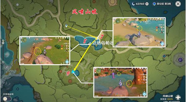 2、第二个区域,风啸山坡,采集点是七到九,耗时应该也是两三分钟,然后一共可以收集到七个嘟嘟莲;