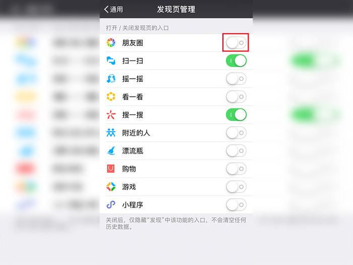 进入之后就可以看到第一个就是朋友圈,默认是开启的,只需要将后面的开关关闭即可;