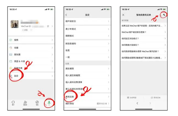 3. 点击进入手机微信中的【我】,然后点击【设置】,在设置页面点击【帮助与反馈】,最后点击右上角的工具图标。