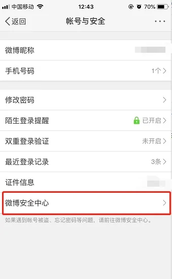 3、进入账号与安全界面后找到并选择然后选择“微博安全中心”如图所示。