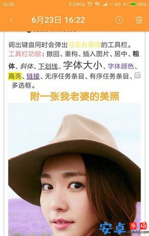 1、图文混排:橙子便签app支持撤回、重构、插入图片、居中、粗体、斜体、下划线、字体大小、字体颜色、高亮、链接、无序任务条目、有序任务条目、多选框。轻松实现精美排版。