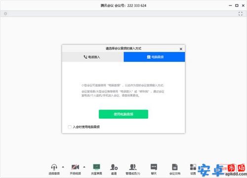 1、当您进入会议中后,会提示您选择音频接入方式,如下图所示: