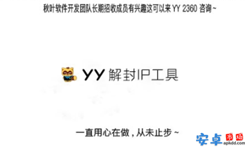 由于上个版本歪歪Ip解封部分电脑解封不了,目前已修复所有电脑,所有YY版本可解封,界面简洁,操作方便~有时候一些不当的言语或者行为会导致大家被封禁,这时候就可以使用这款YY频道ip解封器解封啦,很简单很容易使用的。注意:解封后一定要重新登录yy,否则解封失败注意2:只能解封ip不能解封id哦,被封id请更换号。