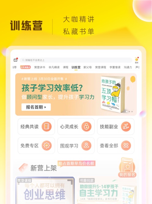 【训练营】:以社群为载体,大咖导师带教为核心,通过“社交互动式”的模式让书友在社群学习中连接、思考、践行,成为更牛的自己。